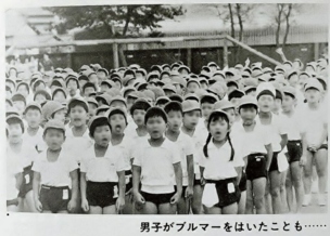 この情報から、画像はパフォーマンス中か、パフォーマンス終了直後の生徒たちであり、彼らの顔が水色または黄土色に塗られているのが確認できます。特に、画像中央の女子生徒は濃紺のブルマーを着用しており、テキストの内容と一致しています。